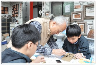 Mr. Chen is our teacher; he demonstrated the manufacturing process of brick carving. He used a brush to write down the topic “The Universe in a Grain of Sand-The Miniature & Brick Carving of Chen Forng-Shean” and introduced carving skills. After listening to his introduction, we personally experienced the skills.