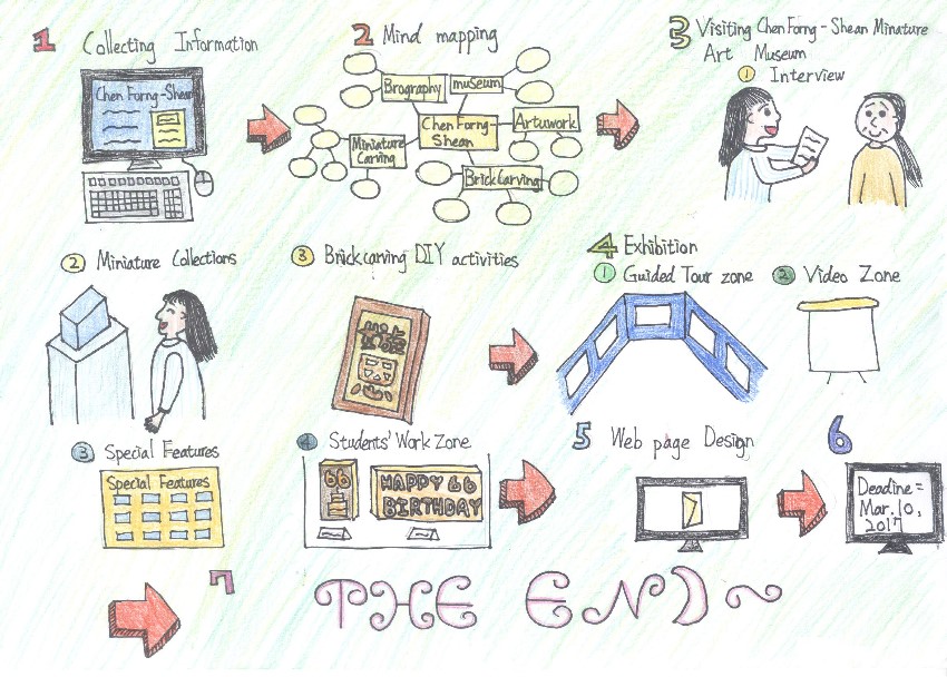 After having an intense discussion with team members and considering recommendations given by our teacher, we decided to use the topic “The Universe in a Grain of Sand- The Miniature & Brick Carving of Chen Forng-Shean” and named our team Pint-sized Passion, reflecting Mr. Chen’s brick carving and miniature carving. To understand Mr. Chen and brick carving and miniature, we collected information online and drafted the mind map as our first step.