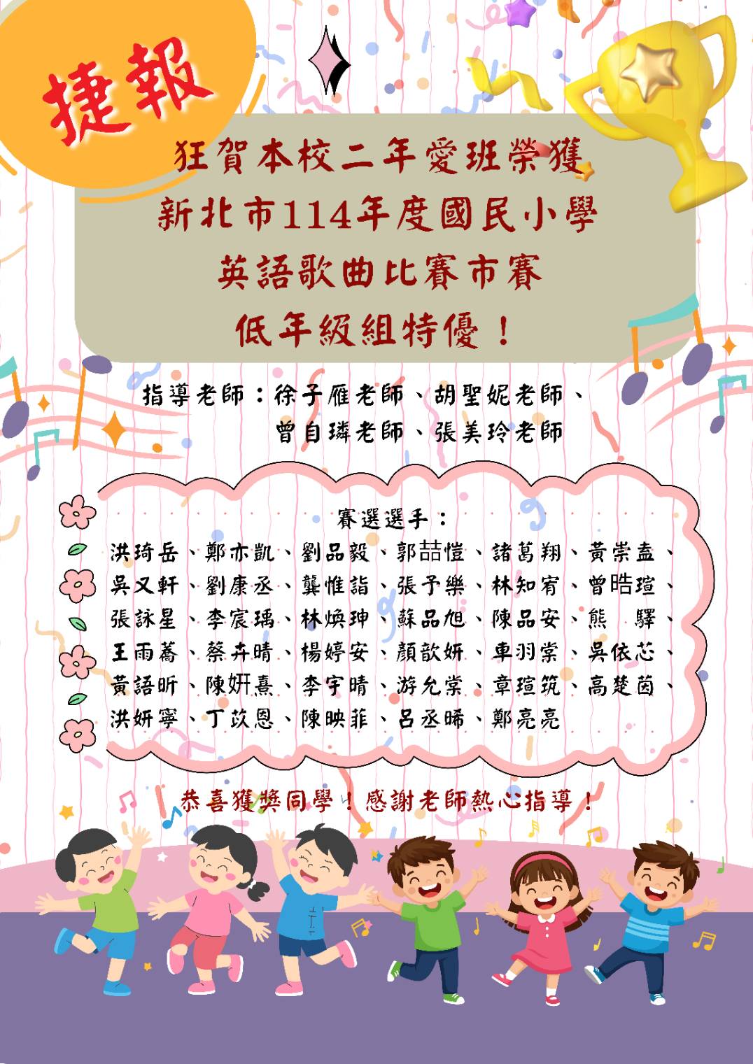 本校二年信班、四年仁班、六年愛班在新北市中區英語歌曲比賽獲得特優之後,晉級全新北市市賽,再度榮獲佳績!